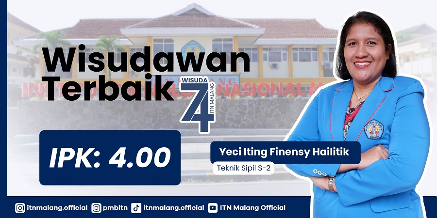 Malang, ITN.AC.ID – Prestasi membanggakan diraih oleh Yeci Iting Finensy Hailitik, alumnus Program Studi Teknik Sipil S-2 (Peminatan Manajemen Wilayah dan Kota), Institut Teknologi Nasional Malang (ITN Malang). Ia lulus sebagai wisudawan terbaik dengan perolehan Indeks Prestasi Kumulatif (IPK) sempurna 4.00. Yeci juga merupakan alumni S-1 Perencanaan Wilayah dan Kota (PWK) ITN Malang, dan berasal dari Kota Kupang, Provinsi Nusa Tenggara Timur (NTT).