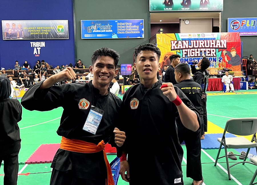 Gilbertus Jhon Paul Ivan UKM PSHT ITN Malang (kanan) bersama lawan tandingnya di Kanjuruhan Fighter Competition 2025. (Foto: Istimewa)