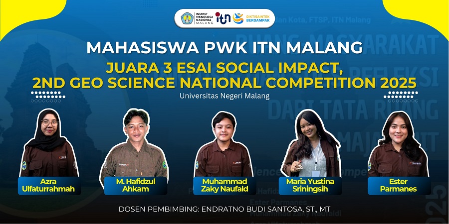 Malang, ITN.AC.ID – Lima mahasiswa Program Studi Perencanaan Wilayah dan Kota (PWK) Institut Teknologi Nasional Malang (ITN Malang) berhasil meraih Juara 3 Esai Social Impact dalam ajang 2nd Geo Science National Competition 2025. Kompetisi esai tingkat nasional ini diselenggarakan secara daring oleh Prodi Geografi, Fakultas Ilmu Sosial, Universitas Negeri Malang (UM), berlangsung dari 6 Juni hingga 7 Juli 2025.