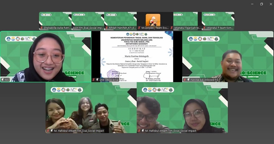 Tim mahasiswa PWK ITN Malang saat menerima awarding Juara 3 Esai Social Impact, 2nd Geo Science National Competition 2025 UM. (Tangkapan Layar Zoom Meeting)